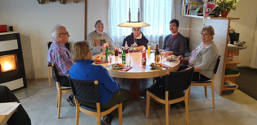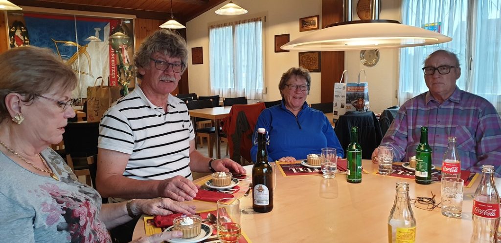 Nach etwas mehr als 2 Stunden Arbeit wurden alle zum Mittagessen gerufen: Beate hatte unterdessen alles vorbereitet für ein reichhaltiges Menu. Es gab erst einen feinen Salatteller, dann folgte das Gulasch mit Teigwaren. Für einen süssen Abschluss sorgte Heide mit einer gebrannten Creme. Es war alles superfein, alle konnten reichlich konsumieren. Danach räumte Beate alles allein auf, während sich die andern wieder an die Arbeit mit dem Blei machten.