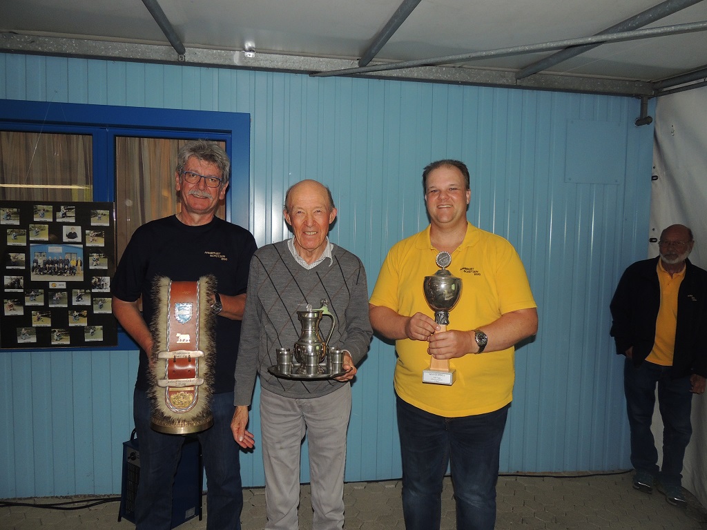 Die Jahresmeisterschaft ist die Kombination von Rohrstich, Endschiessen und den 4 besten Resultaten der auswärts besuchten Feste. Wieder schwang Sepp obenaus und erhielt die Zinnkanne. Der Wanderpreis für den 2. Rang ging an Heinz (Glocke), und derjenige für den 3. Rang ging an Pascal (Pokal).