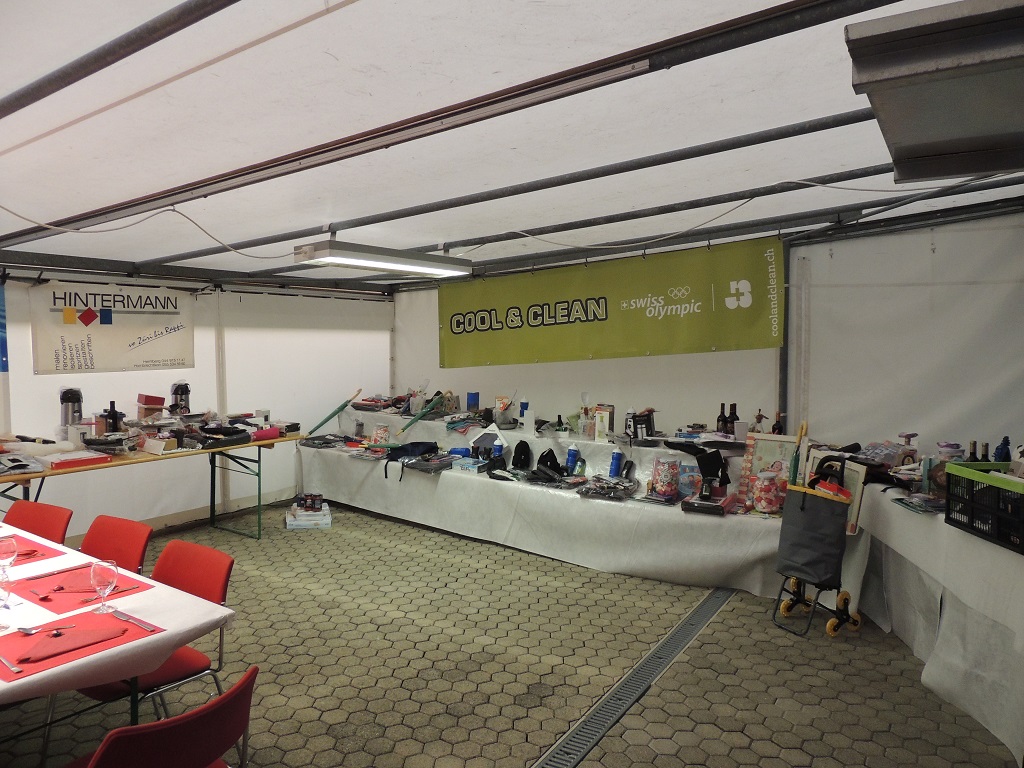 Für die Tombola war ein grosser, vielseitiger Gabentisch bereitet worden. Dreimal konnten Lose erworben werden. Heinz pries die Preise an, Pascal zog die Nummern. Jeder Gewinner konnte einen reichen Preis mitnehmen. Danach folgte die Schätzfrage: Heinz wollte wissen, wie viele Käsestücke er verteilt hatte (Käsestich, Müsterli, Tombola).